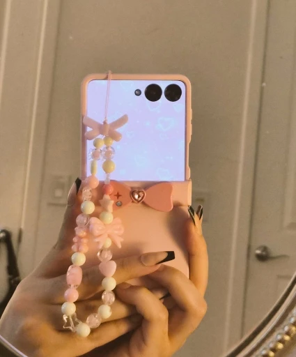 It hangs effortlessly, adds that subtle extra grip when you’re living one‑handed, and turns even your most chaotic mirror pic into something camera‑roll ready. The twin bows bring the softness. The bead mix keeps it fun. Together? It’s giving main character who absolutely planned this.